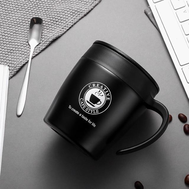 Taza térmica práctica con un diseño moderno y asa para los amantes del café. Ideal como regalo.