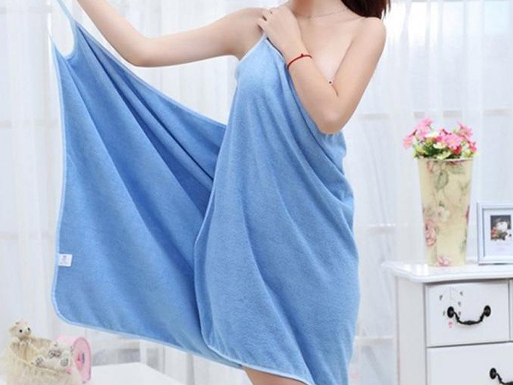 Una toalla ingeniosamente diseñada es muy útil en el baño, en la playa o en el camping. Te puedes "vestir" con la toalla de manera práctica y, gracias a los agujeros para las manos, no tienes que preocuparte de que se te caiga.