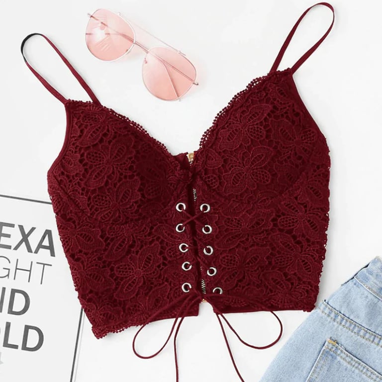 Top de encaje para mujer con tirantes finos. Corte corto y ajustado con cordones en la parte delantera. Disponible en varios colores.