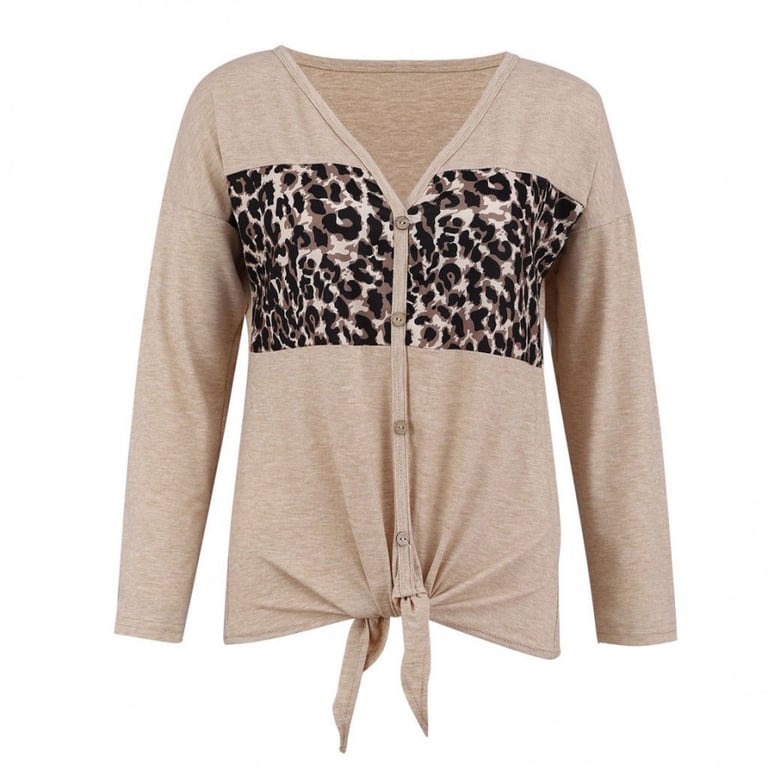 Top de mujer con mangas largas y escote en V. El top tiene un cierre de botones y un lazo decorativo en la parte inferior. Estampado con motivo de leopardo.
