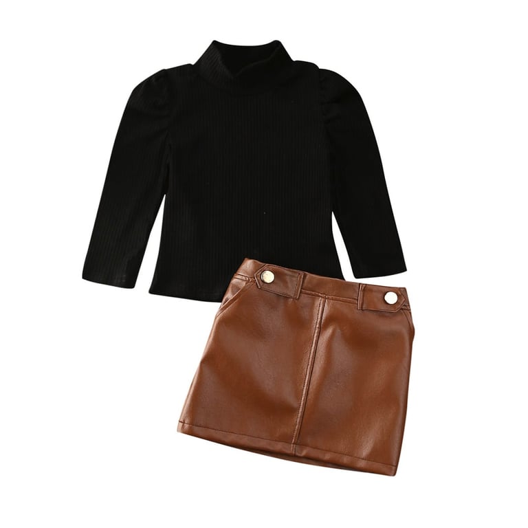 Top de moda negro para niña con falda marrón de cuero sintético.