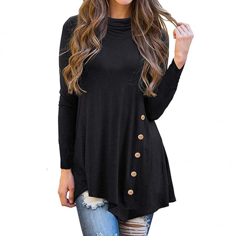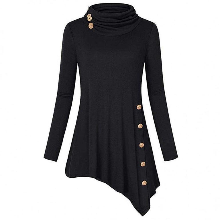 Top de mujer con cuello alto y mangas largas. Corte asimétrico y suelto con botones decorativos en el lado. Disponible en varias opciones.