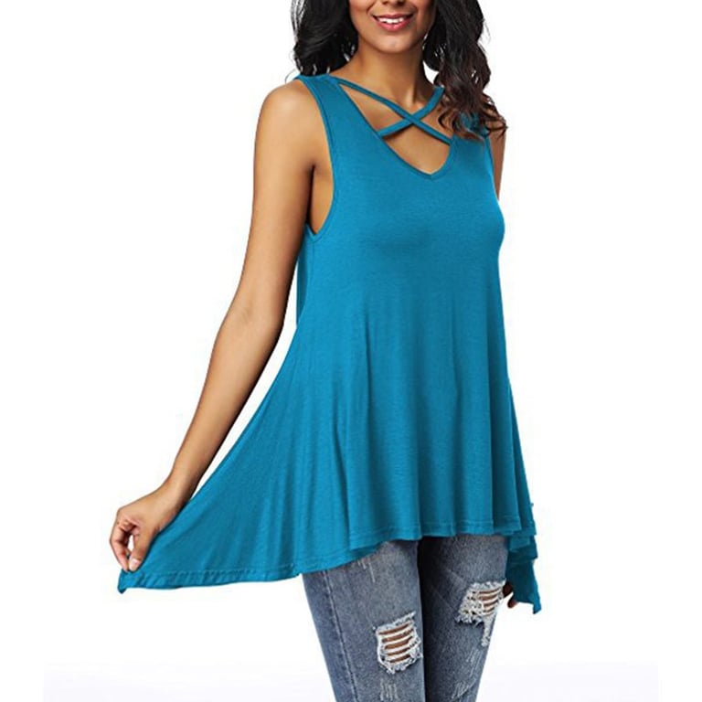 Top sin mangas para mujer. El top tiene un escote en V con un cordón decorativo y un corte asimétrico suelto. Disponible en varias opciones de color.