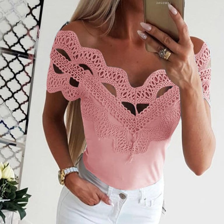 Top ajustado para mujer con mangas cortas. Escote con hombros descubiertos y ribete de encaje. Disponible en varias opciones de color.