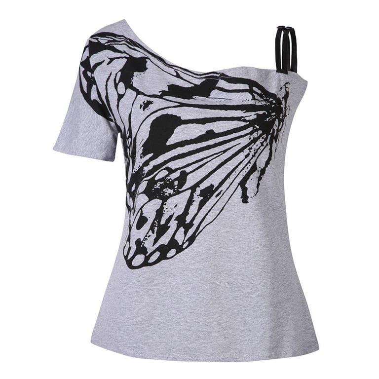Top/camiseta de mujer con mangas cortas y escote con hombro descubierto. Corte holgado. Impresión de mariposa en la parte delantera. Disponible en varios colores.