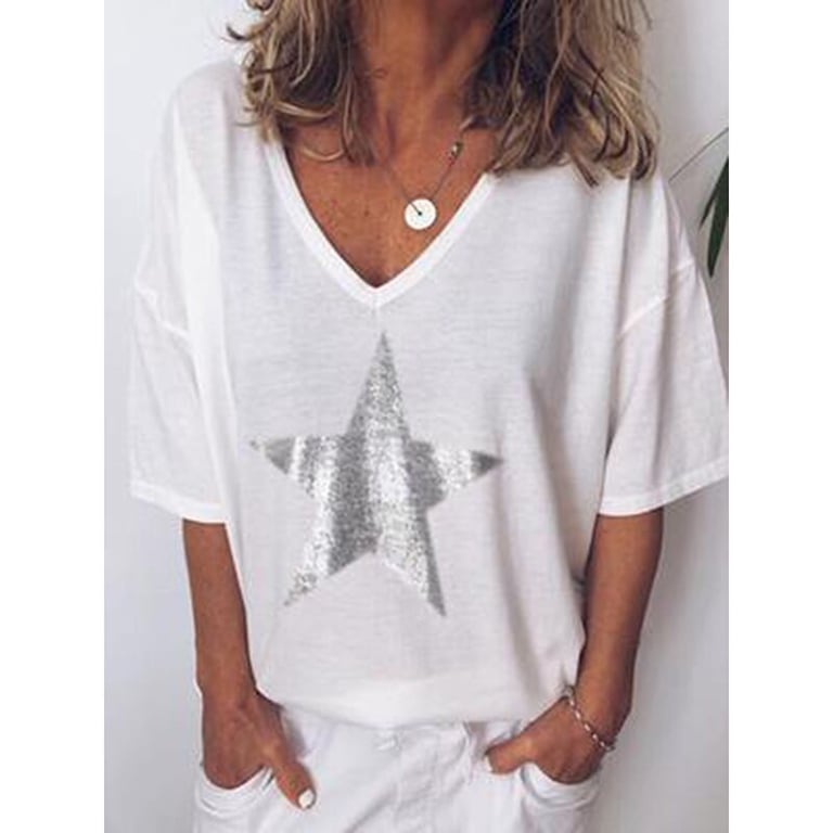 Top de mujer con mangas cortas y acampanadas y escote en V. Corte holgado con estampado brillante en la parte delantera. Varias opciones de color.