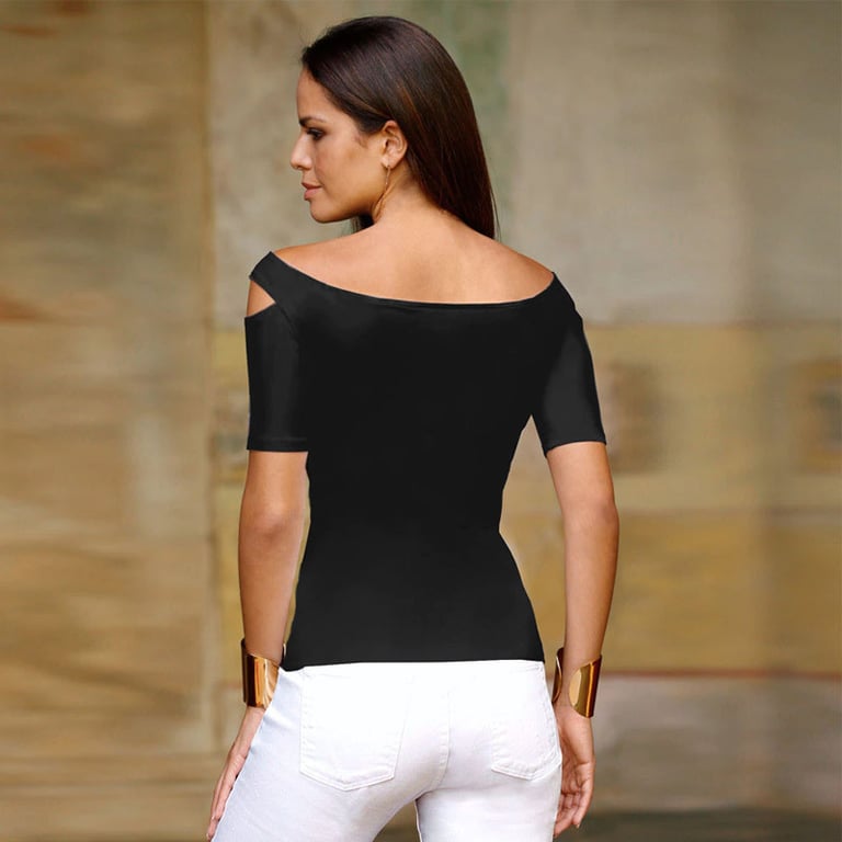 Camisa de mujer de manga corta y hombros descubiertos. La camiseta tiene un escote redondo y cortes en las mangas. Disponible en tres colores: negro, blanco, burdeos.