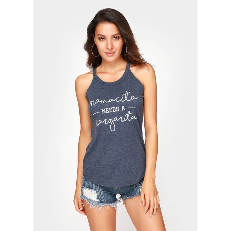 Top de mujer con tirantes y escote halter. Corte ajustado. Estampado con texto en la parte delantera.