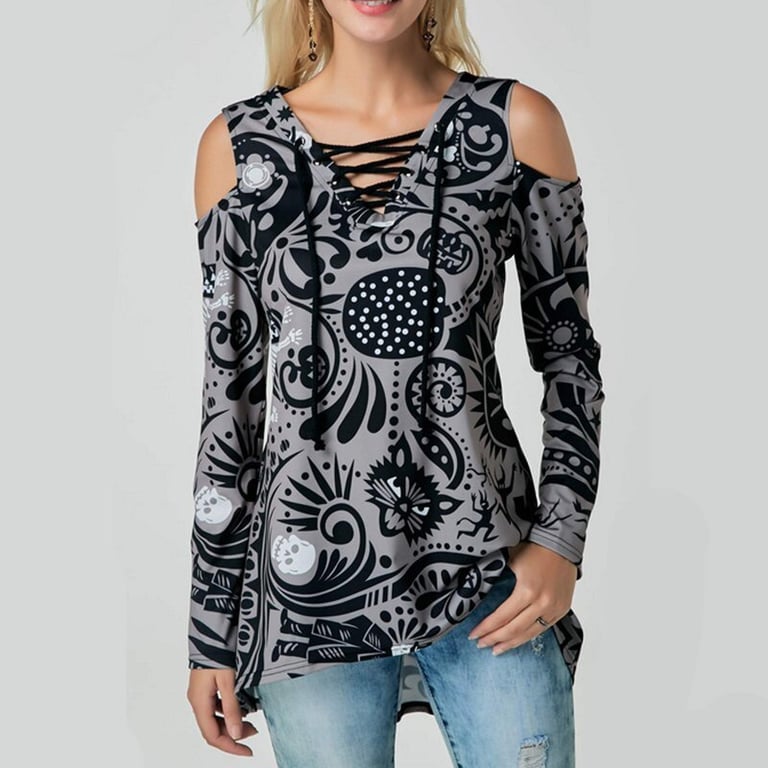 Top de mujer con mangas largas y cortes en los hombros. Corte ajustado y más largo con escote en V y cordones. Estampado con un patrón colorido. Disponible en varias opciones.