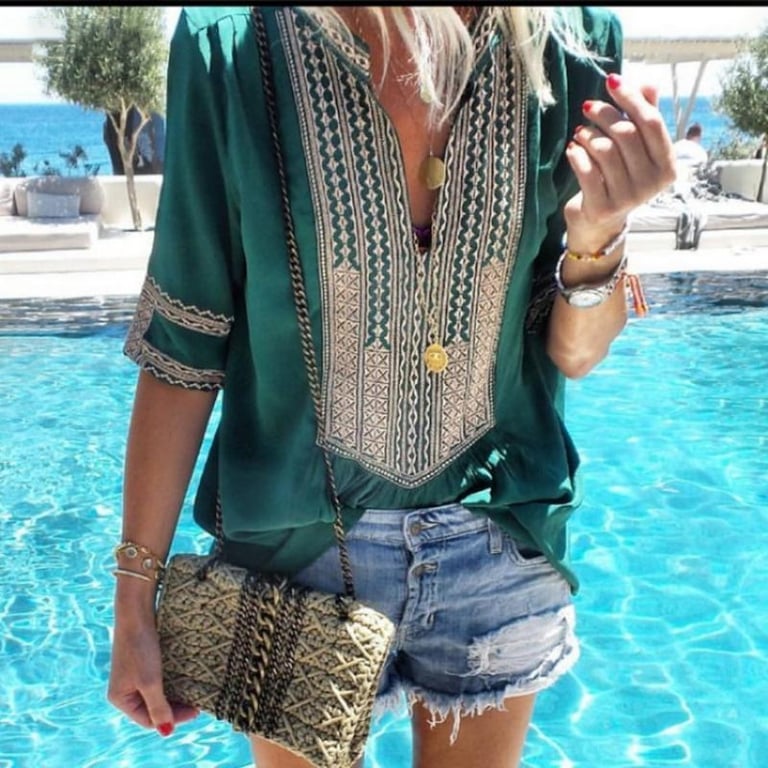 Elija el color adecuado para usted de la gama Estrada. El elemento principal es el elegante escote en V y la impresión antigua en la tela. Gracias a su hermoso corte, se ajustará a todas las mujeres.