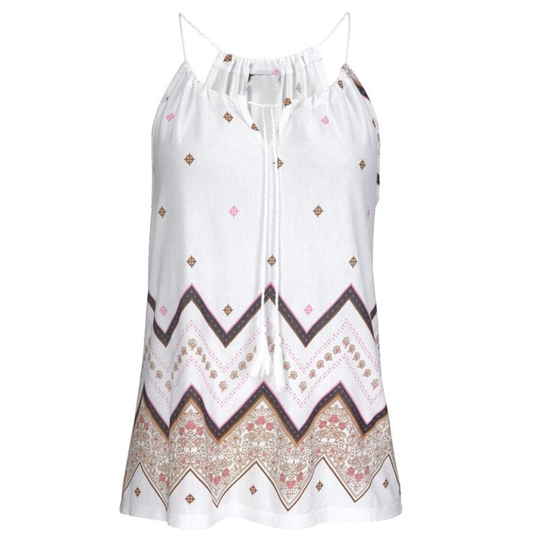 Top de mujer con tirantes finos tipo espagueti. El top tiene un escote redondo con un cordón decorativo. Material ligero y aireado. Patrón étnico colorido. Disponible en dos variantes.