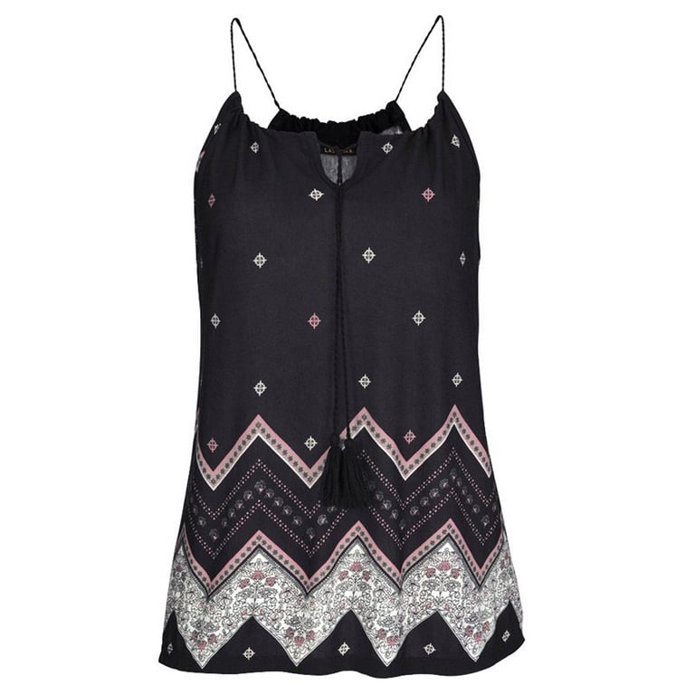 Top de mujer con tirantes finos tipo espagueti. El top tiene un escote redondo con un cordón decorativo. Material ligero y transpirable. Patrón étnico colorido. Disponible en dos variantes.
