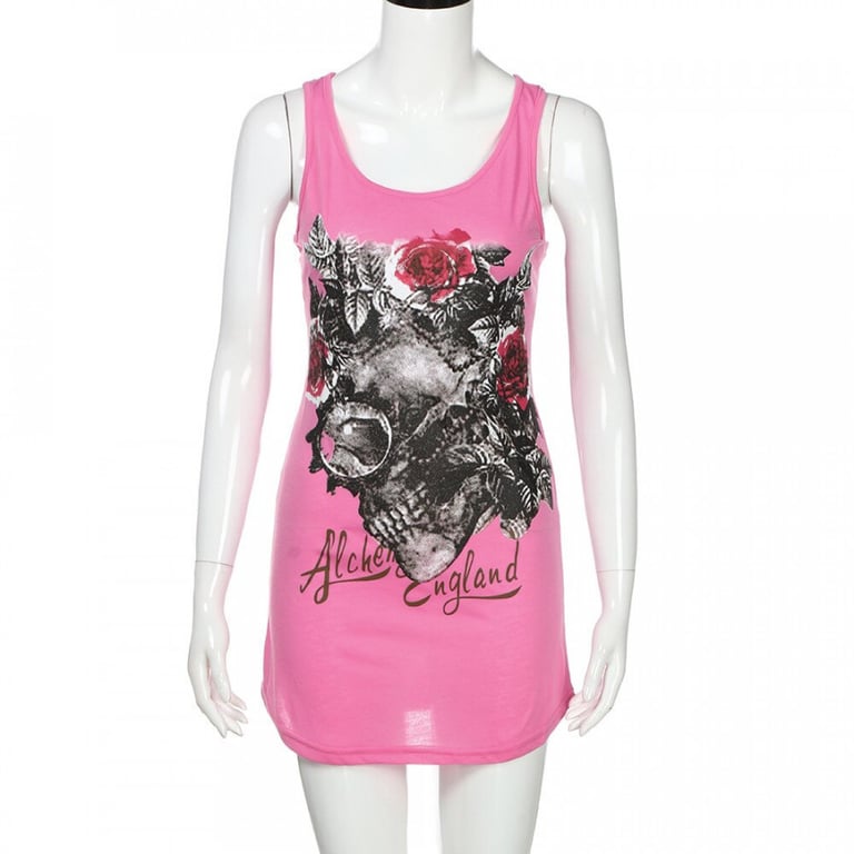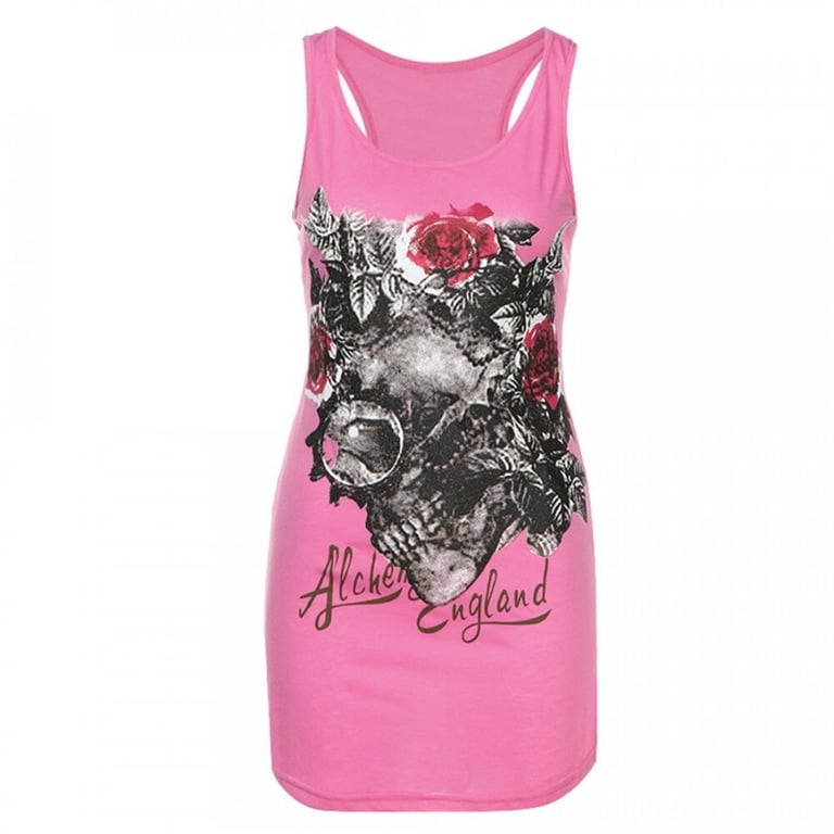 Top de mujer sin mangas. Escote redondo. Estampado colorido en la parte frontal. Corte ajustado y más largo. Disponible en varias opciones de color.