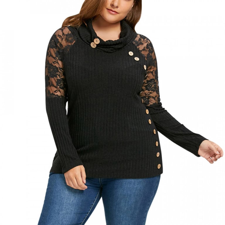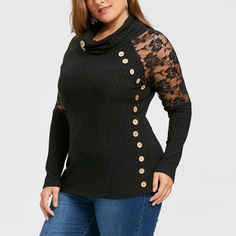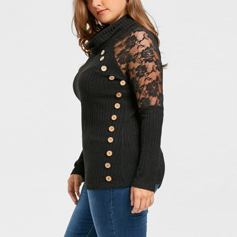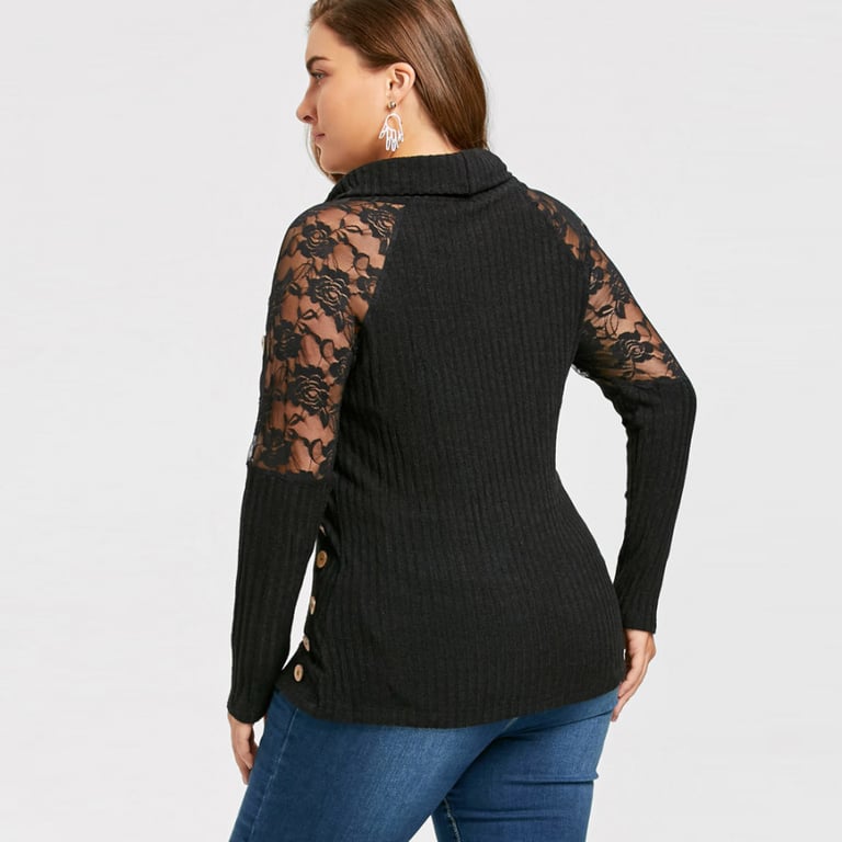 Top de punto para mujer con cuello de chal y mangas largas decoradas con encaje. Corte ajustado y más largo con botones decorativos.