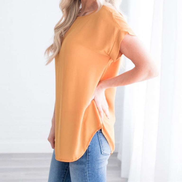 Camisa de mujer de manga corta y escote redondo. Diseño elegante de un solo color. Corte recto y suelto. Disponible en varias opciones de color.