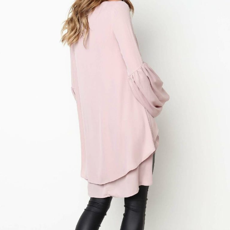 Top/camiseta larga de mujer con corte asimétrico y suelto. La camiseta tiene mangas largas y amplias y un escote redondo. De un solo color. Disponible en varias variantes.