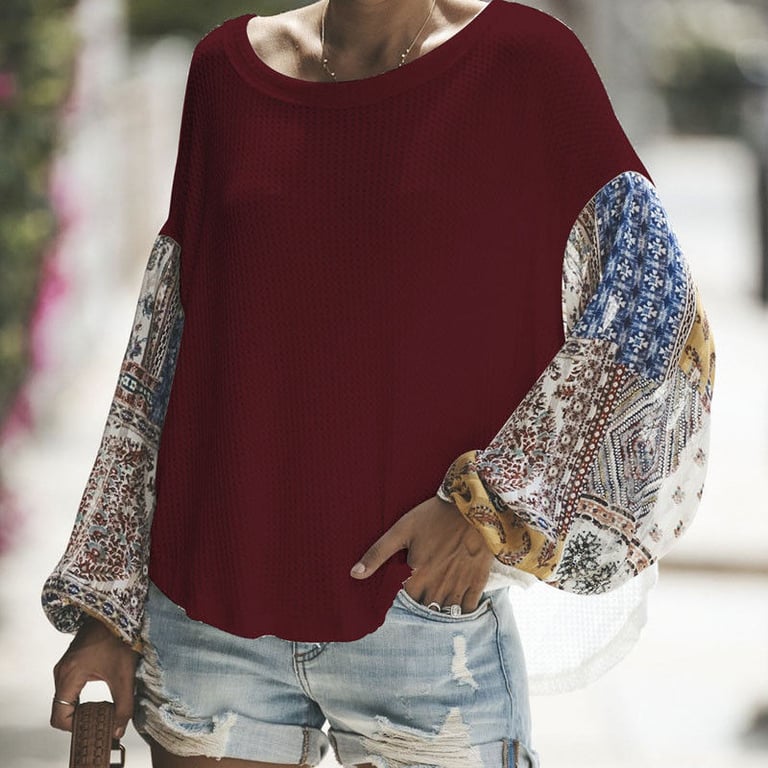 Top de punto para mujer, camiseta con escote redondo. Manga larga y amplia con estampado de colores. Corte suelto y cómodo. Disponible en varias opciones de color.
