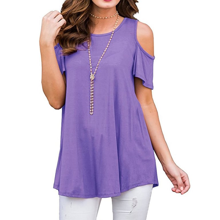 Top de mujer con mangas cortas y hombros descubiertos. La camiseta tiene un corte suelto y más largo con escote redondo. Disponible en varias opciones de color.