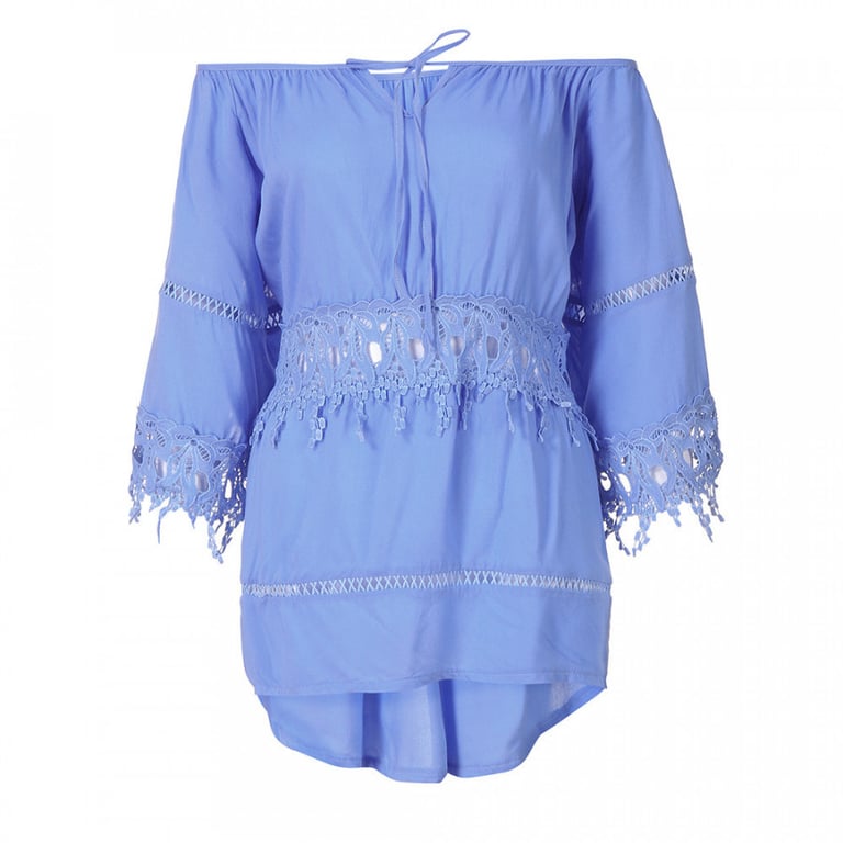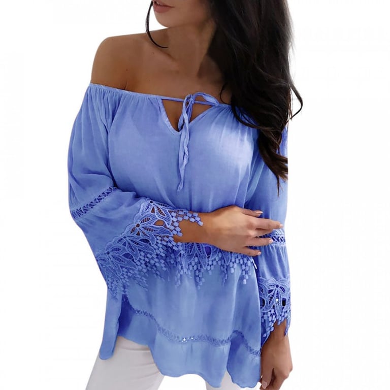 Blusa de túnica para mujer con escote y cordones, y hombros descubiertos. Manga larga y amplia con encaje. Corte holgado. Material ligero y agradable. Tallas grandes. Disponible en varios colores.