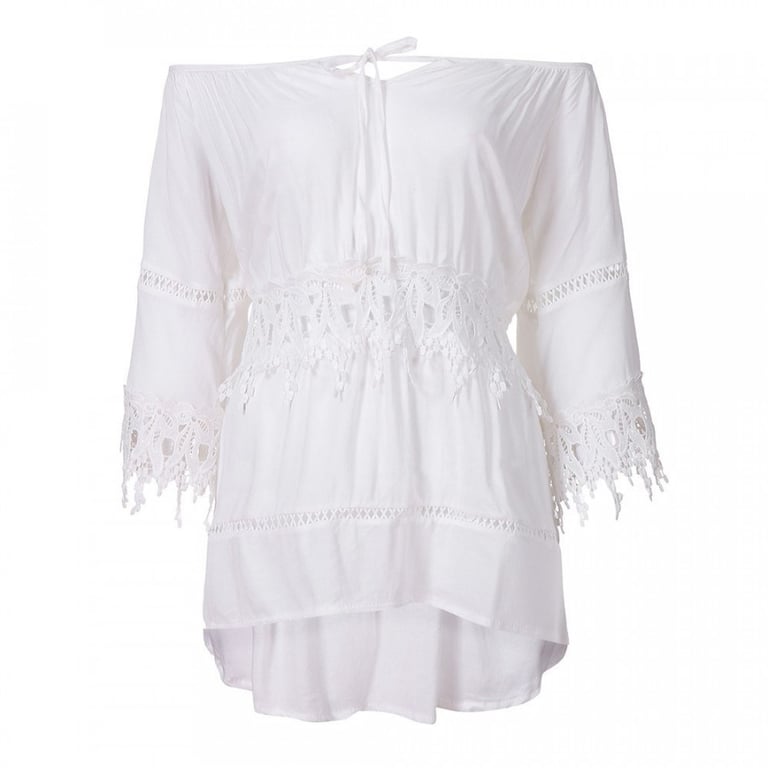 Blusa tunicada para mujer con escote y cordones, y con los hombros al descubierto. Manga larga y amplia con borde de encaje. Corte holgado. Material ligero y agradable. Tallas grandes. Disponible en varios colores.