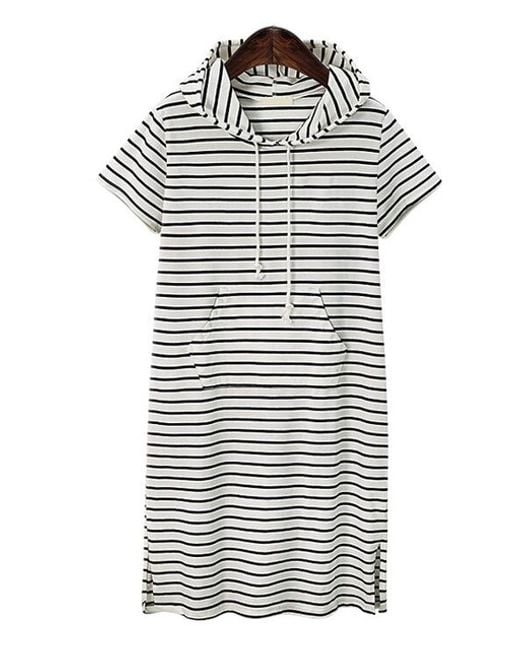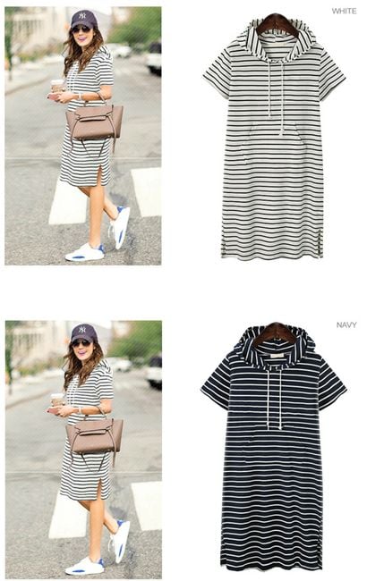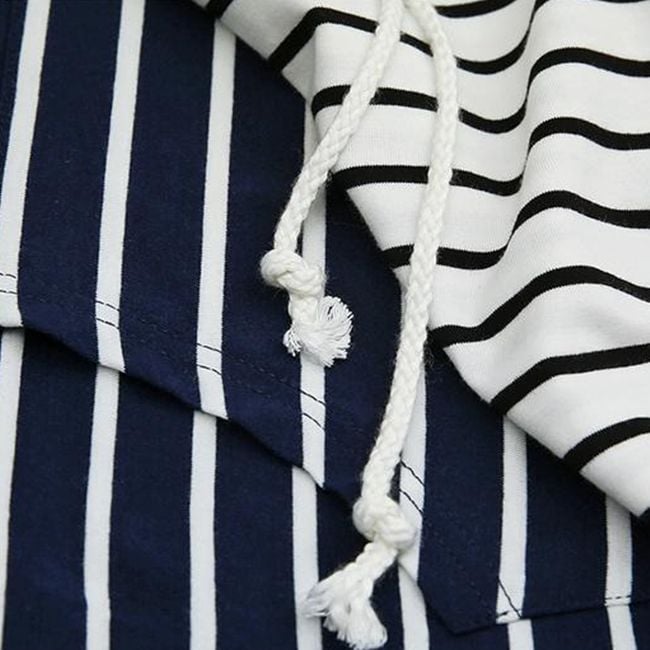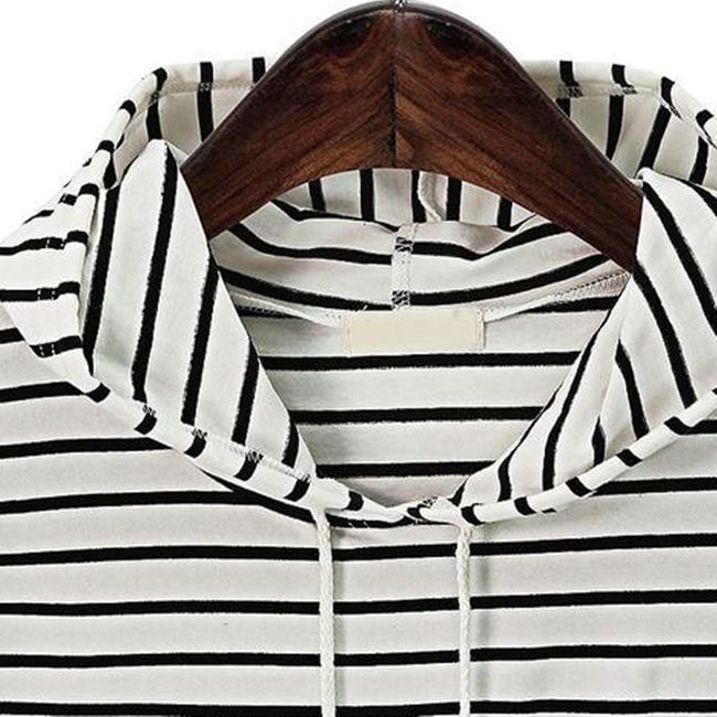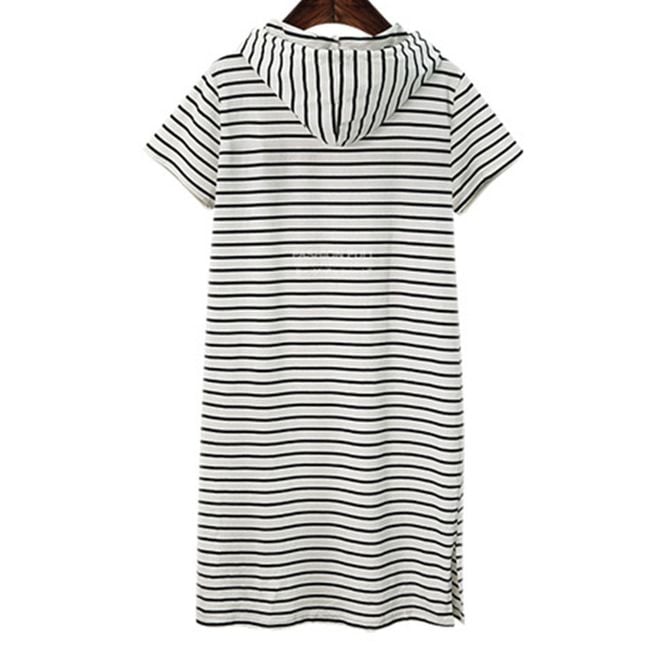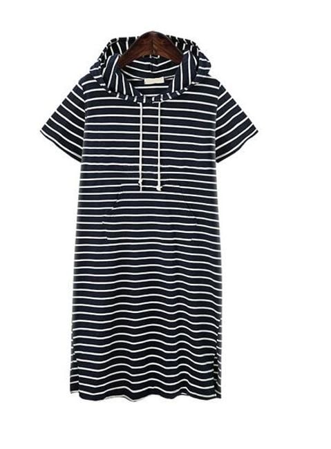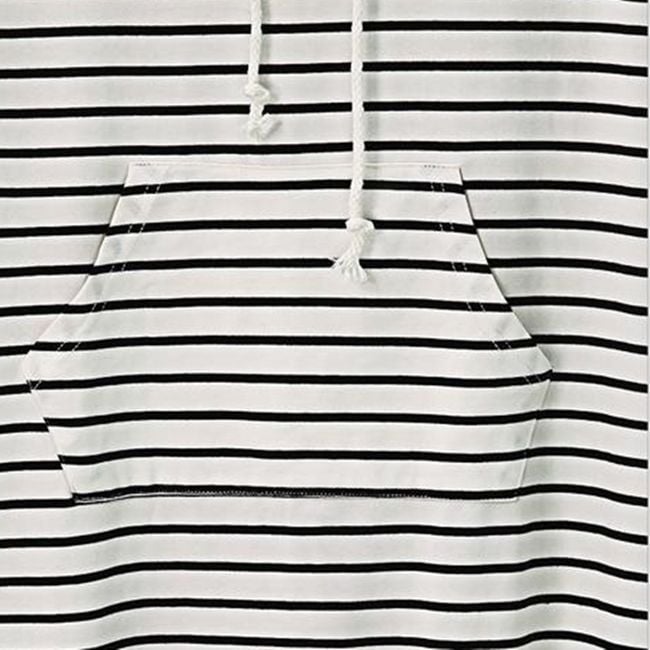 El vestido a rayas con capucha está hecho de un material de sudadera cómodo. Tiene un bolsillo tipo canguro en el abdomen. Está disponible en dos colores y varias tallas.