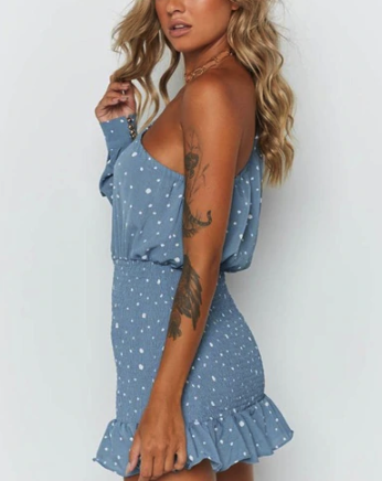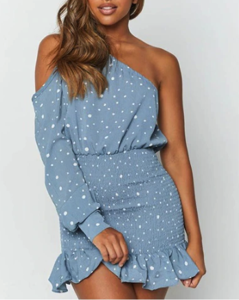 Vestido azul con lunares y un hombro caído.