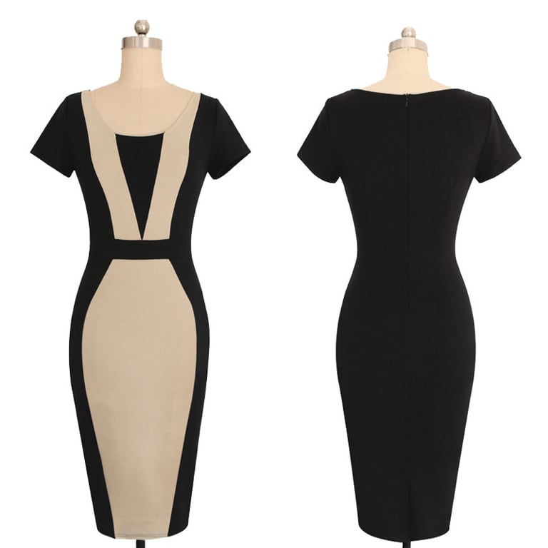 Vestido de cóctel para mujer en un diseño elegante en combinación de dos colores. El vestido tiene un corte ajustado, mangas cortas y escote redondo. Disponible en varias variantes.