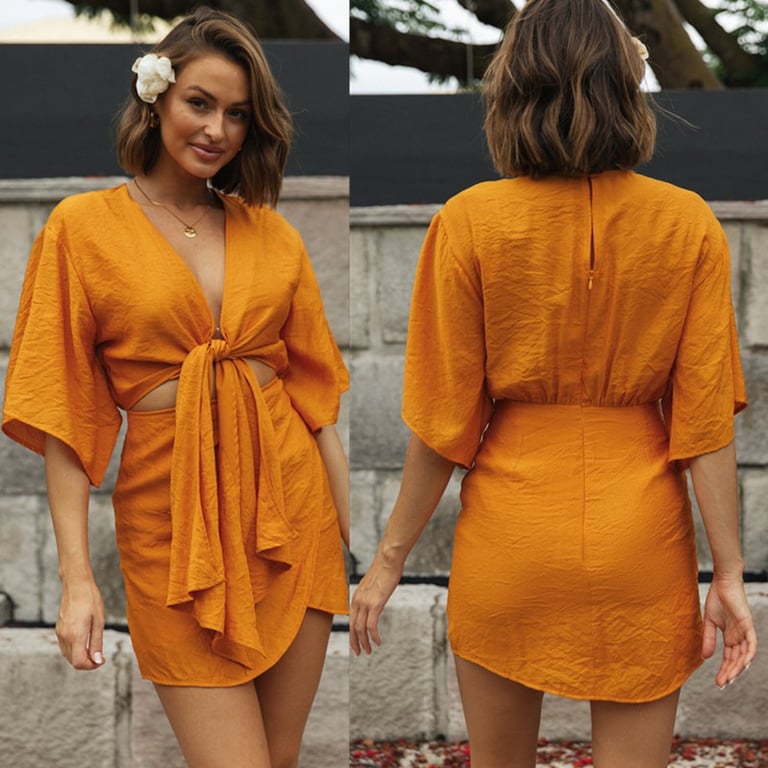 • Mangas largas y sueltas, falda plisada y un atrevido escote anudado.