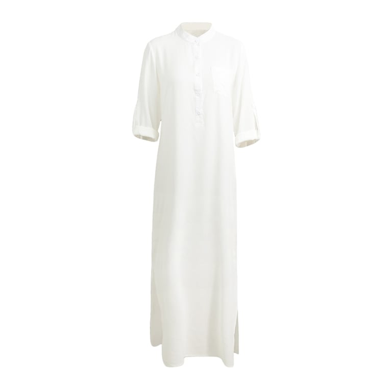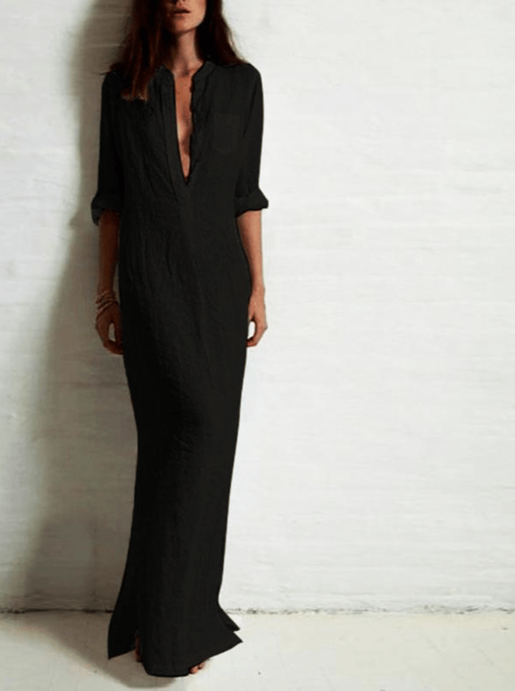 Vestido largo y cómodo para mujer con mangas 3/4 y escote en V. El vestido es largo hasta el suelo. Ideal para la temporada de verano.