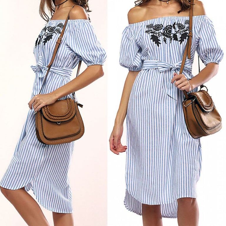 Vestido de camisa para mujer con mangas abullonadas y escote con hombros al descubierto. Corte suelto con cinturón para atar en la cintura. Estampado con patrón a rayas.