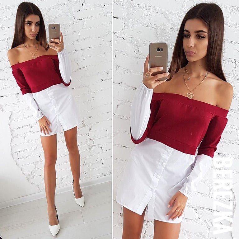 Vestido mini de mujer con mangas largas. El vestido es de estilo camisa con hombros descubiertos y mangas largas. Disponible en varios colores.