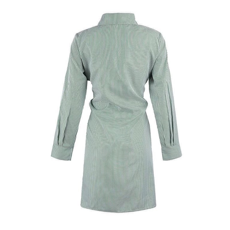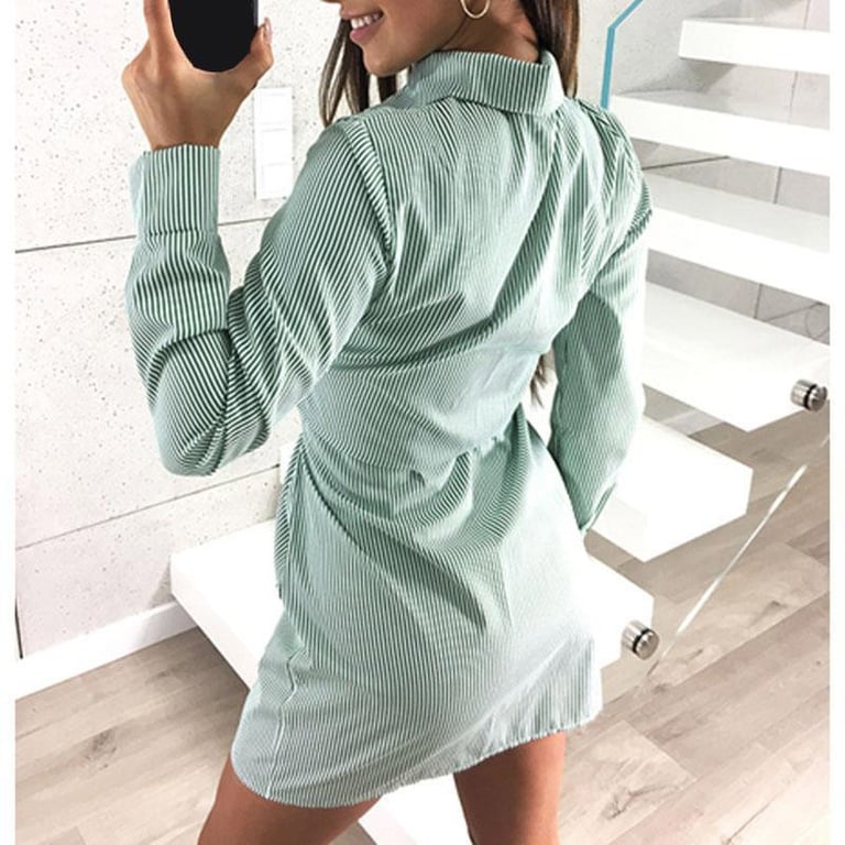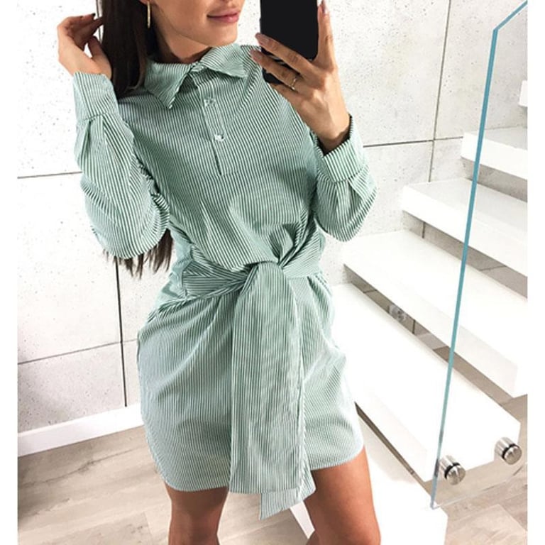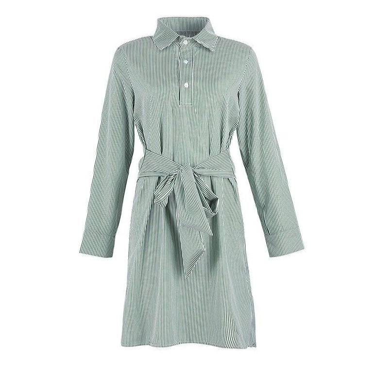 Vestido corto de camisa para mujer con mangas largas. El vestido tiene cuello, cierre de botones y un cinturón para ajustar en la cintura. Patrón con finas rayas. Disponible en varios colores.