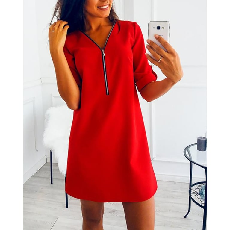 Vestido de mujer de corte suelto en estilo de camisa. El vestido tiene un escote en forma de V con un cierre decorativo de cremallera. Material ligero y agradable. Disponible en varias opciones de color.