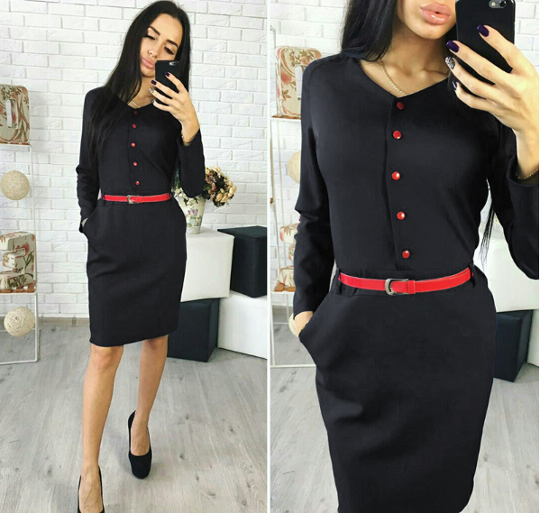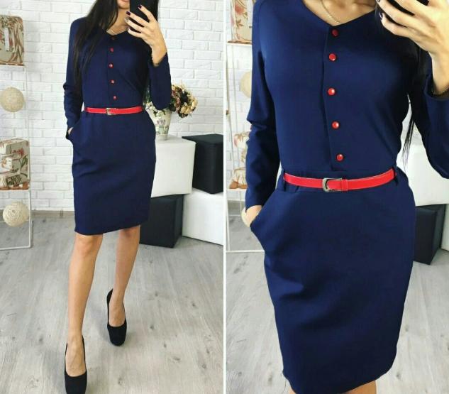 Vestido de cóctel elegante en azul oscuro con cinturón rojo.