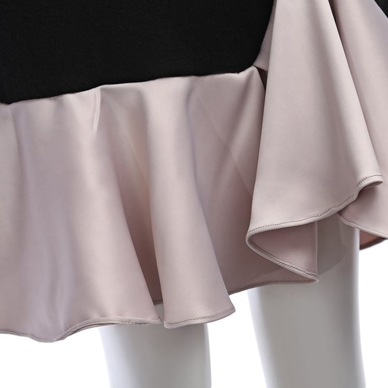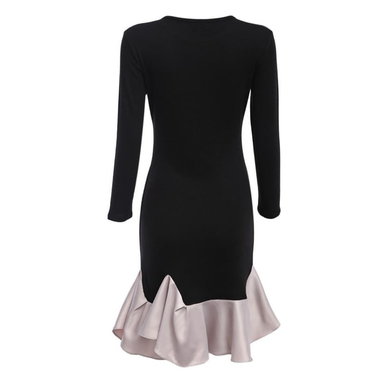 Vestido de noche ajustado para mujer. Ideal para fiestas o eventos. El vestido tiene mangas largas, escote redondo y la parte inferior está adornada con un volante en color dorado.