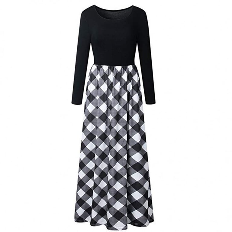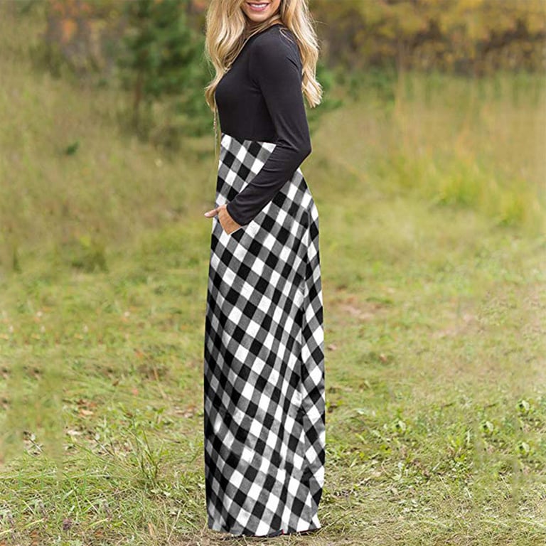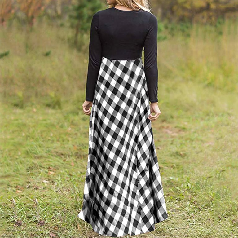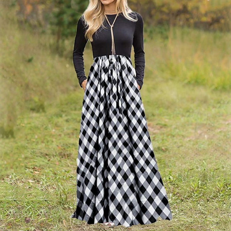 Vestido maxi de mujer con mangas largas y escote redondo. El vestido tiene una larga falda amplia con un patrón de cuadros. Disponible en tres variantes.