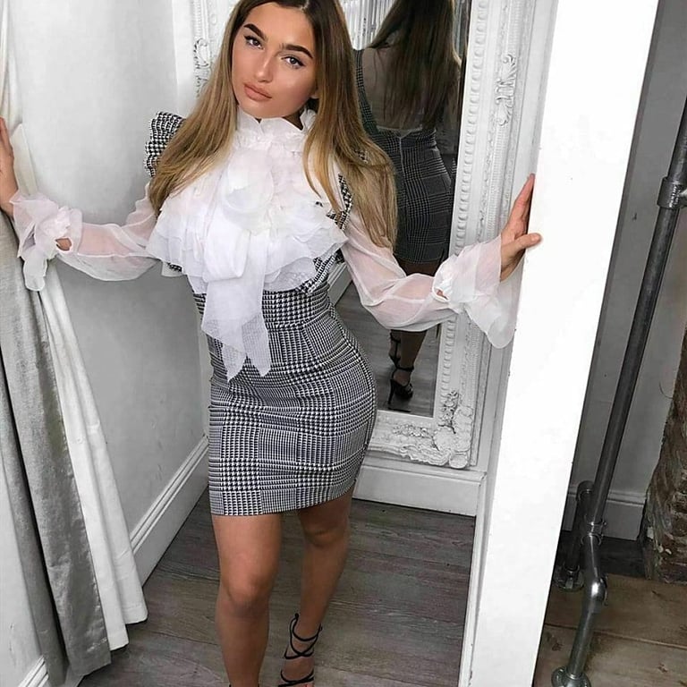 Un vestido mini único con cintura alta y tirantes largos.