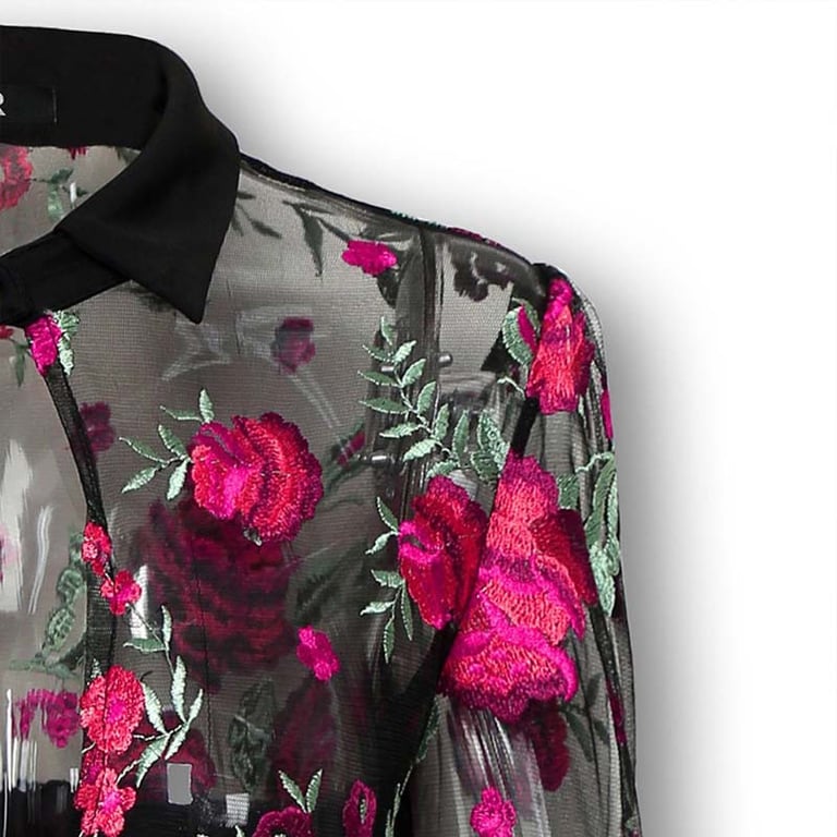 Vestido de mujer con mangas transparentes y un hermoso patrón.