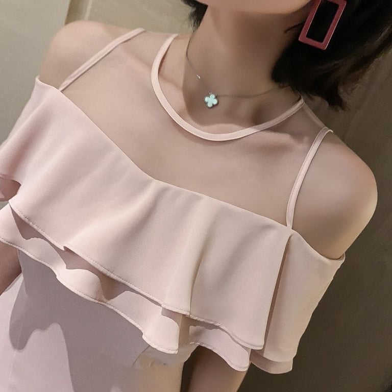 Hermoso vestido de fiesta con escote adornado con volantes.