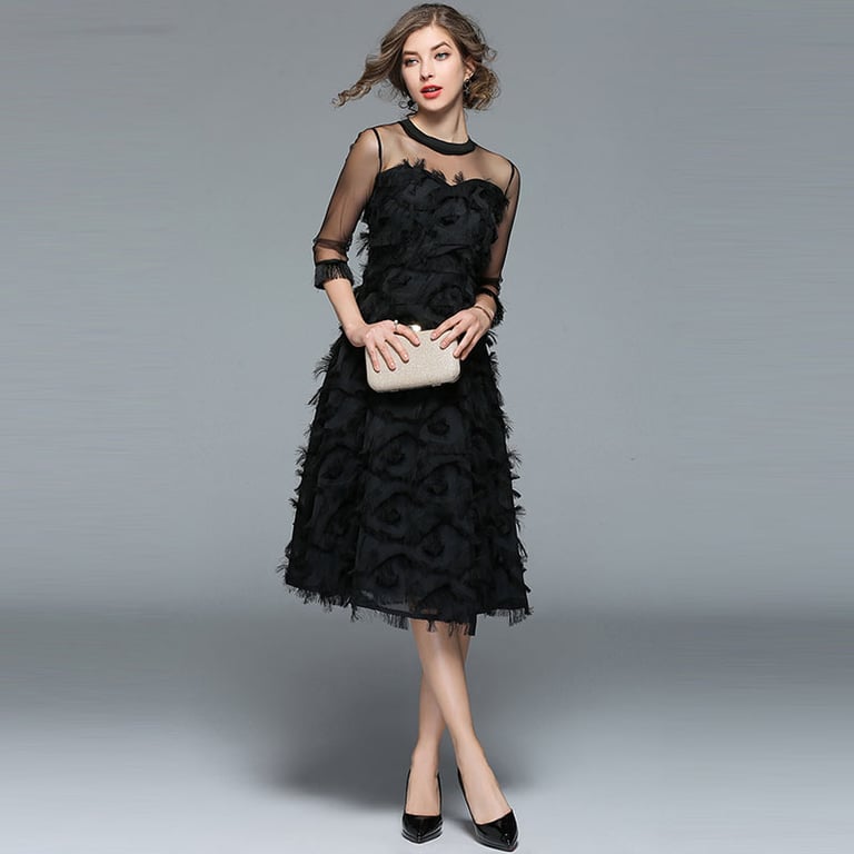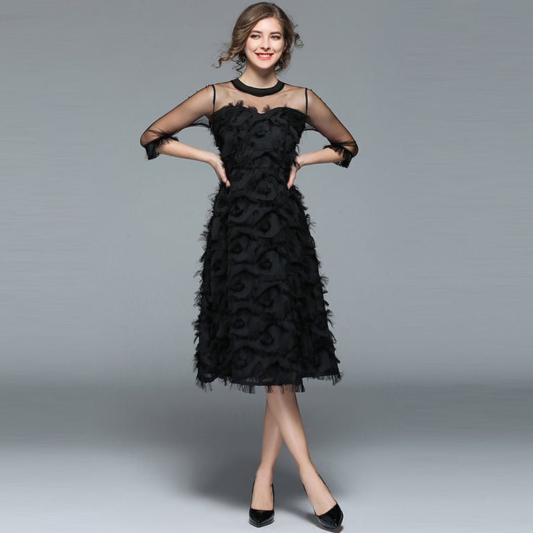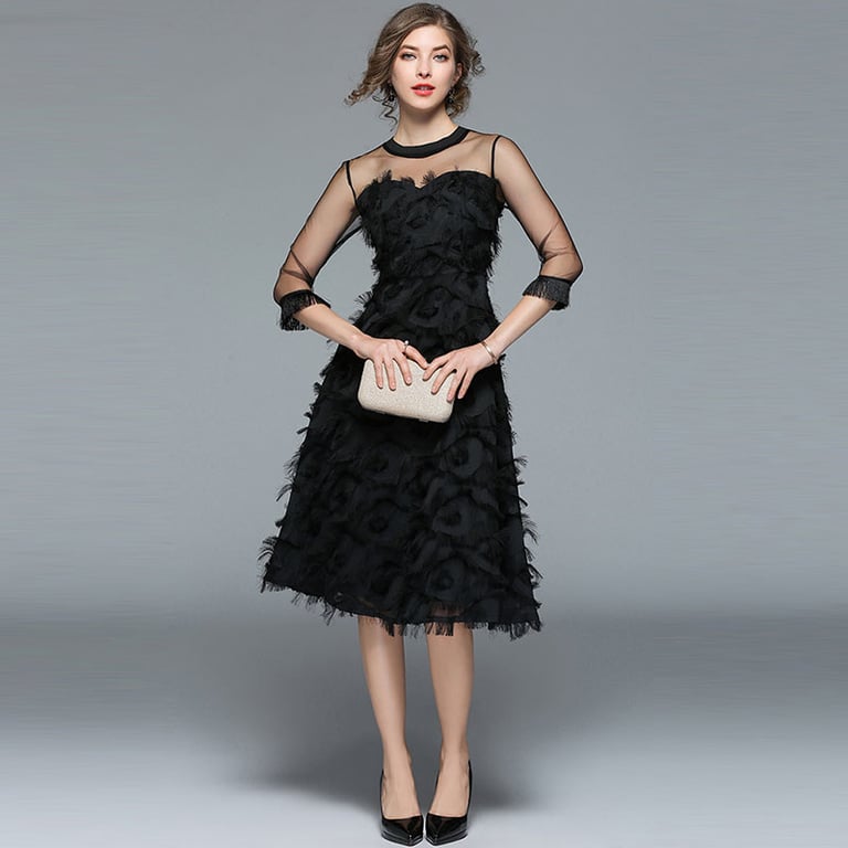 El vestido tiene un escote redondo y mangas tres cuartos de material transparente.