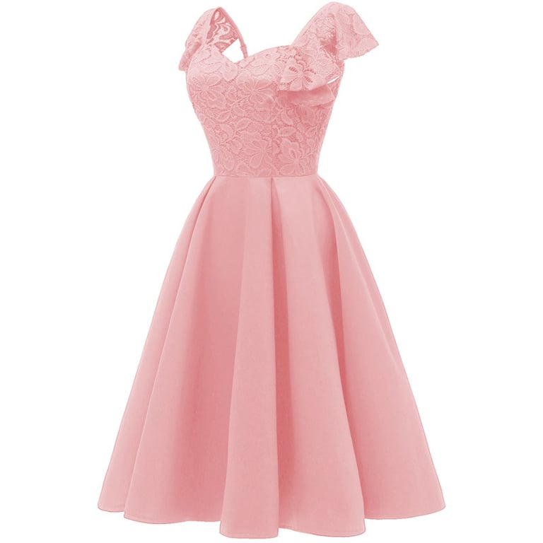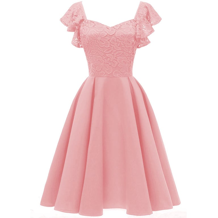 Vestido romántico de mujer con mangas cortas con volantes y una falda en forma de A. La parte superior del vestido está adornada con delicado encaje. Escote en la espalda con cierre de cremallera. Ideal para un baile o evento social. El vestido está disponible en tres variantes de color.