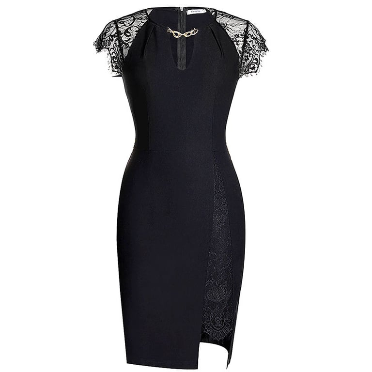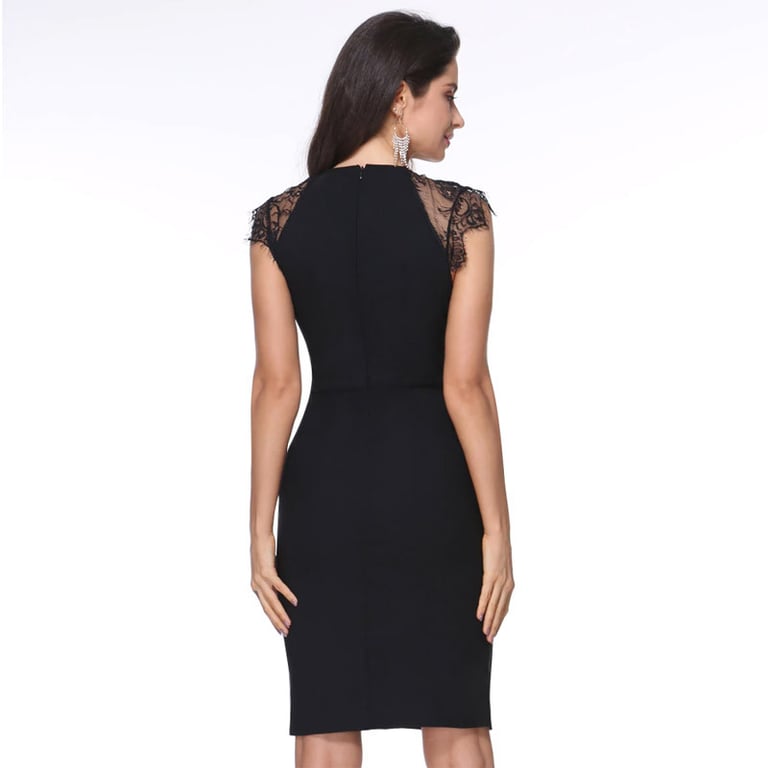 Vestido de cóctel negro para mujer con longitud hasta la rodilla. El vestido tiene una pequeña y discreta abertura. La manga y la abertura están adornadas con delicado encaje negro. El escote está decorado con una cadena plateada.
