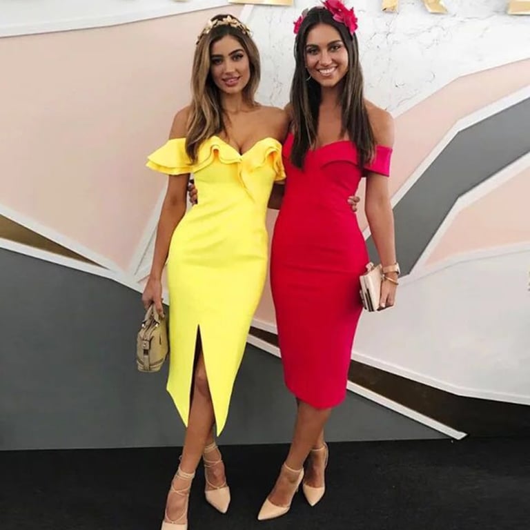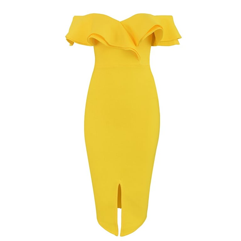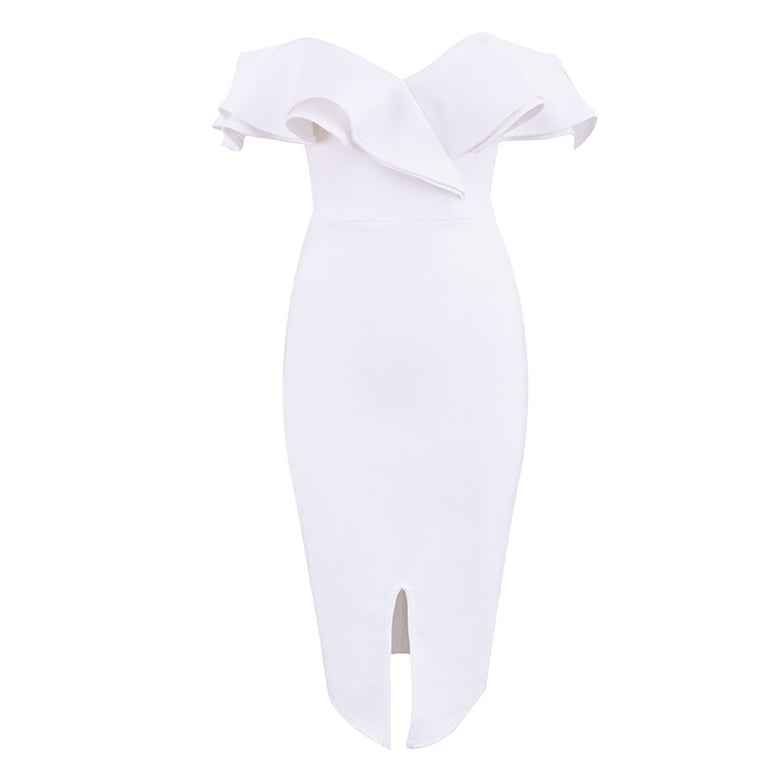 Elegante vestido de mujer con una alta abertura y volantes.