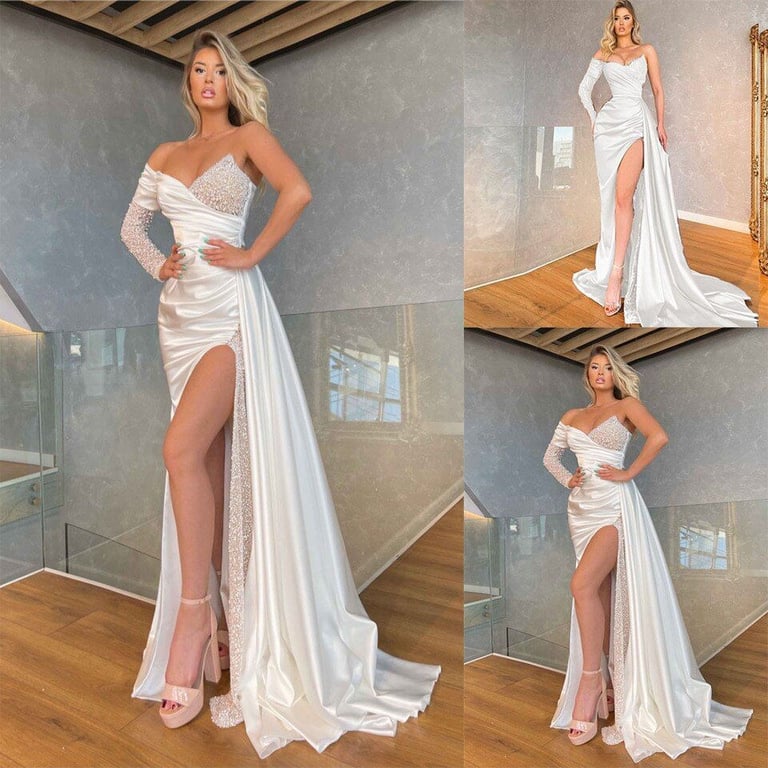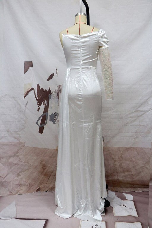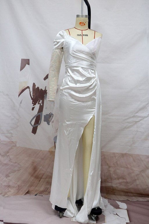 Este impresionante vestido de un solo brazo y lentejuelas es perfecto no solo para un baile, sino también para una boda.