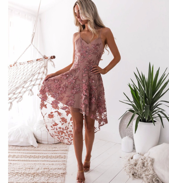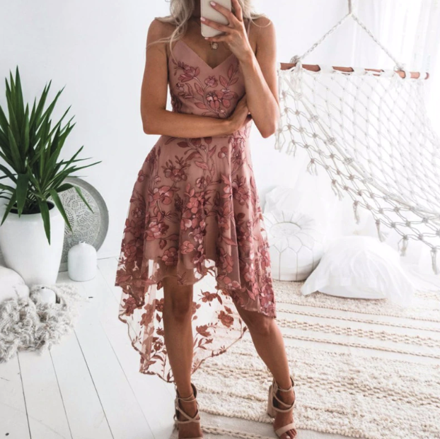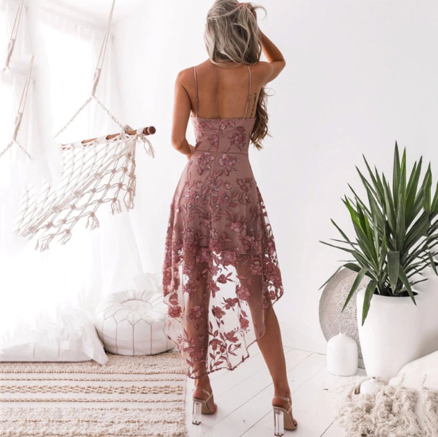 Vestido de gala elegante en rosa oscuro con encaje en la espalda.
