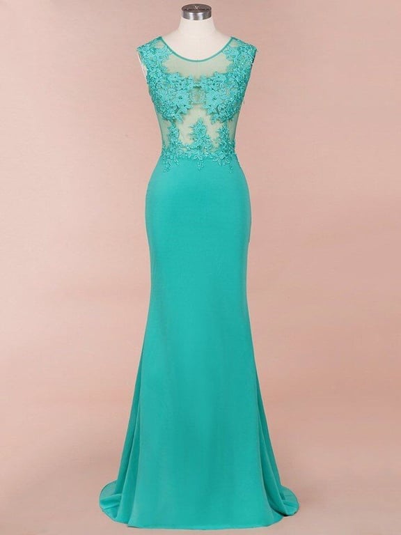 El vestido de gala está adornado con encaje alrededor del escote.
