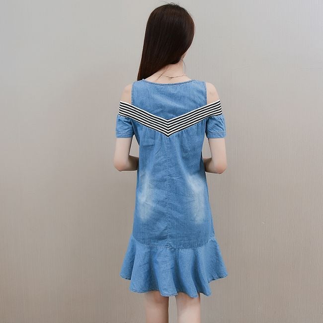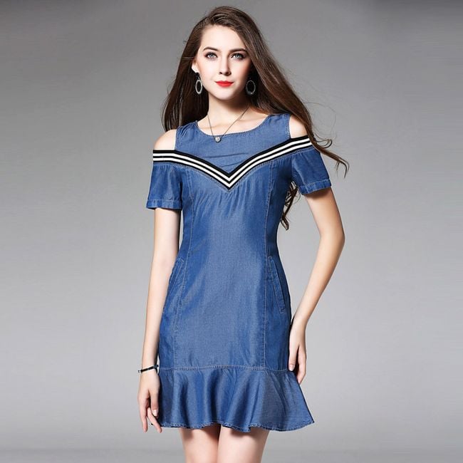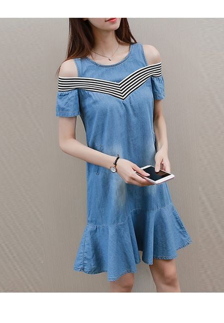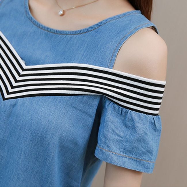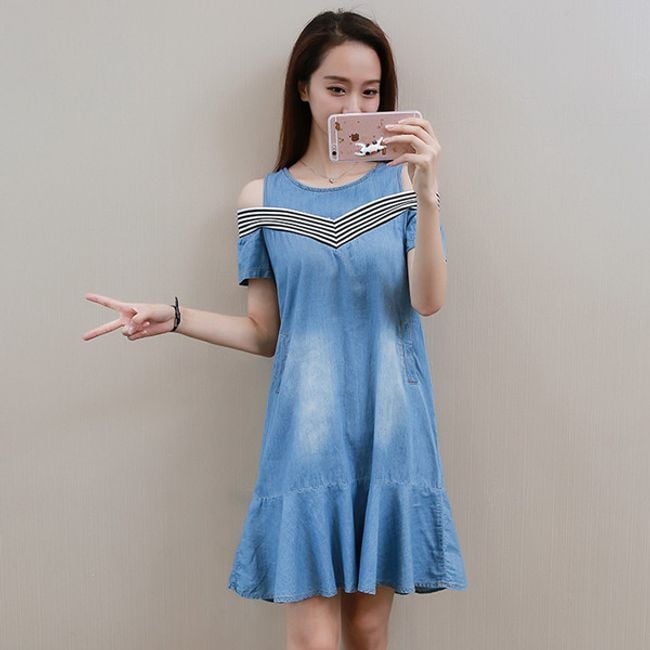 ¡El vestido de mezclilla será una prenda genial para el verano! Tiene los hombros al descubierto y está decorado con un detalle a rayas. Puedes elegir entre 2 colores. Se indican las medidas del producto, no del cuerpo.