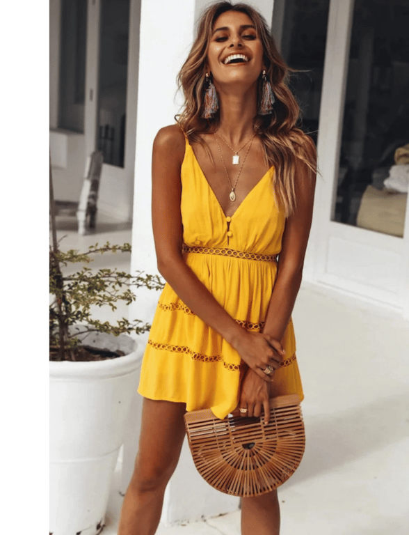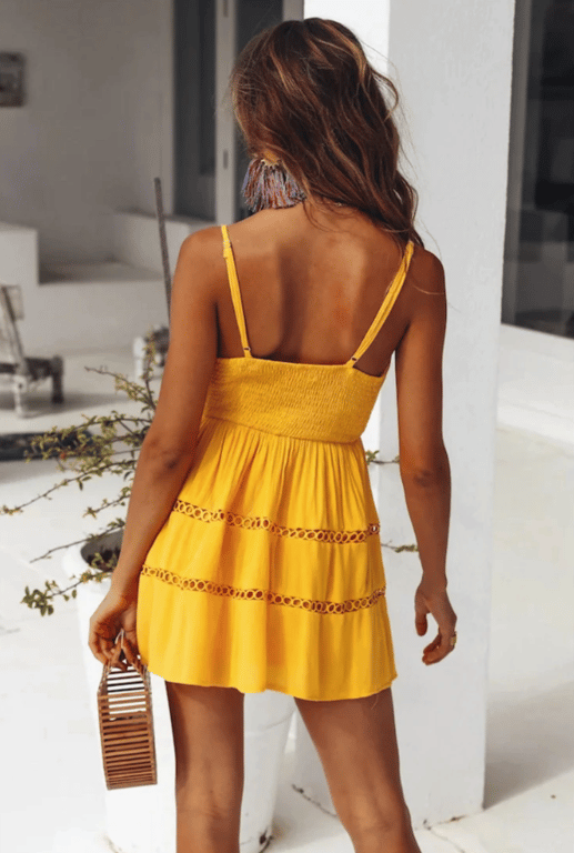 Vestido de mujer amarillo mostaza sencillo y ligero con tirantes finos.