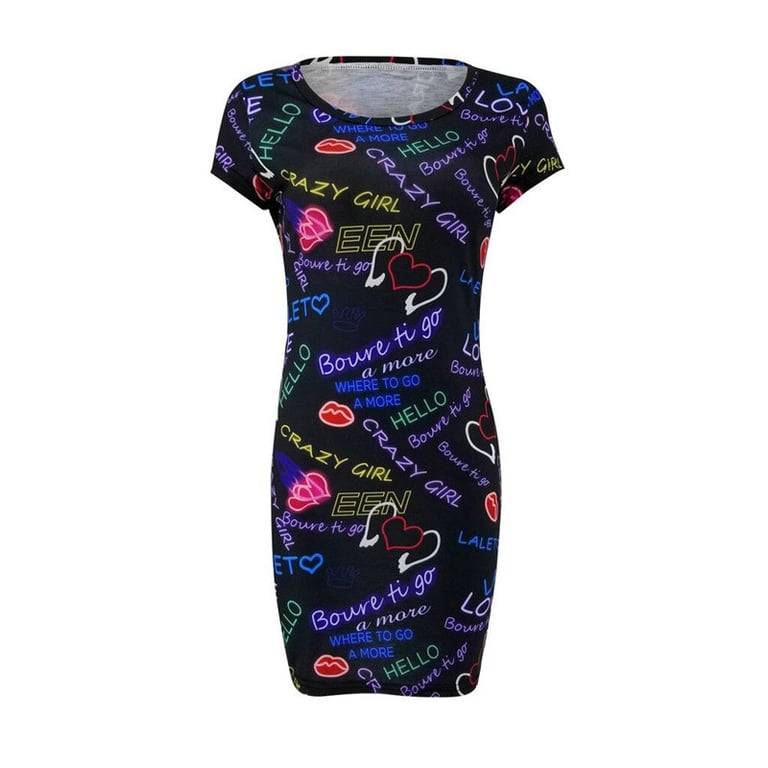 Vestido corto de mujer con mangas cortas y escote redondo. Corte ajustado con estampado de color en toda la superficie.