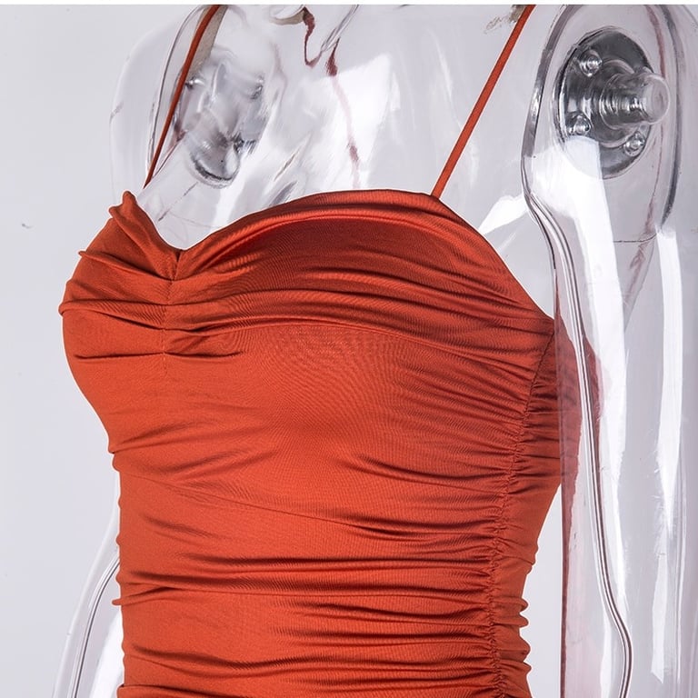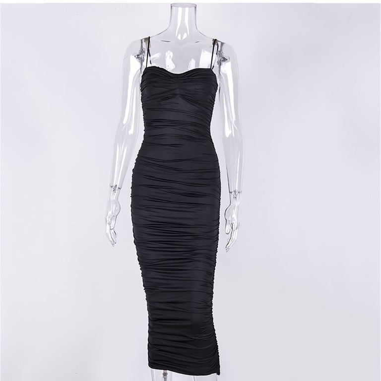 Vestido fruncido de longitud midi con tirantes finos.